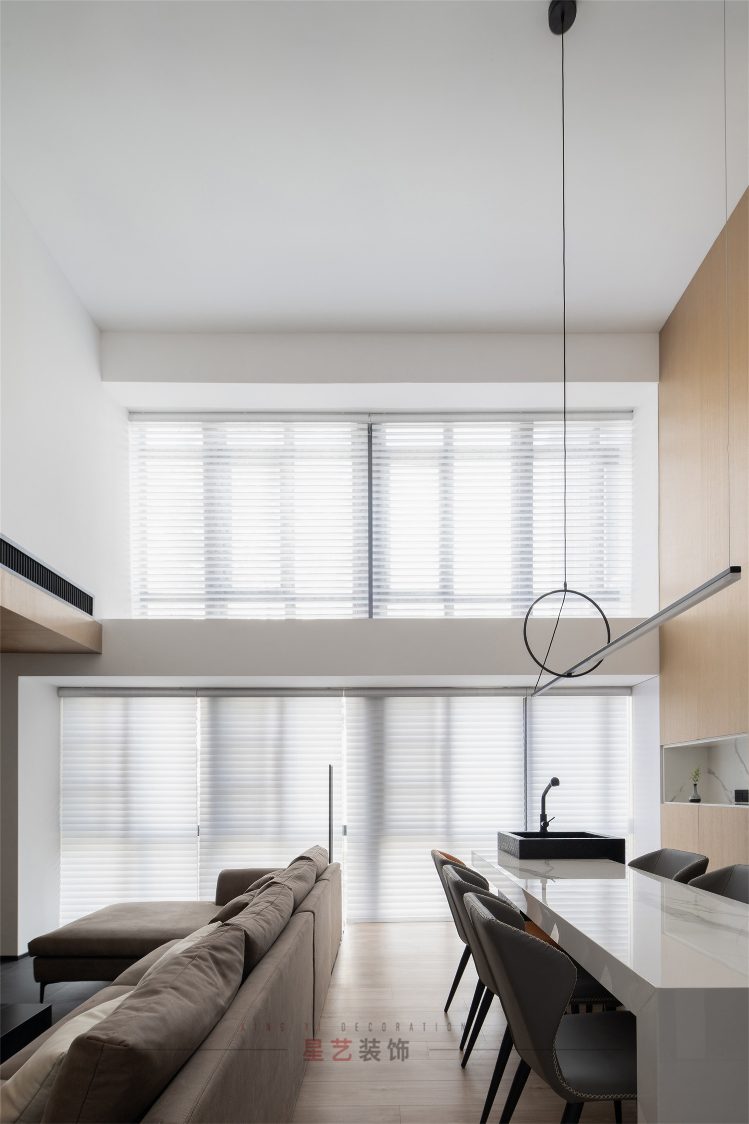 客廳:簡潔的設計,大面積的百葉窗制造極好的光影效果,不管任何天氣都擁有最佳的采光,內嵌的電視機搭配下沉式空間的處理手法帶給業主沉浸的舒適體驗,主色調黑白灰,在各個區域中都有獨立的對應系,精簡而規整,大方而得體。
